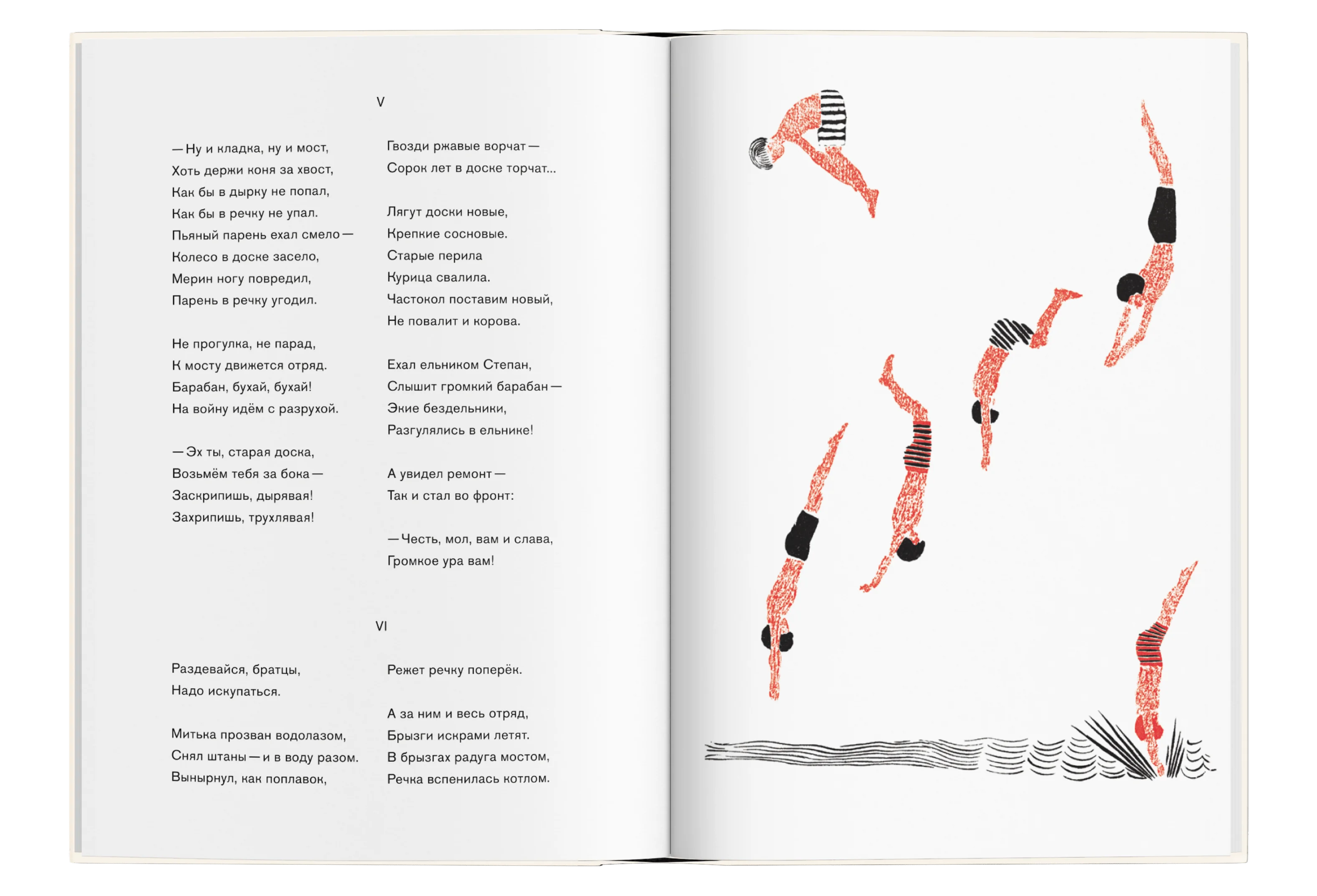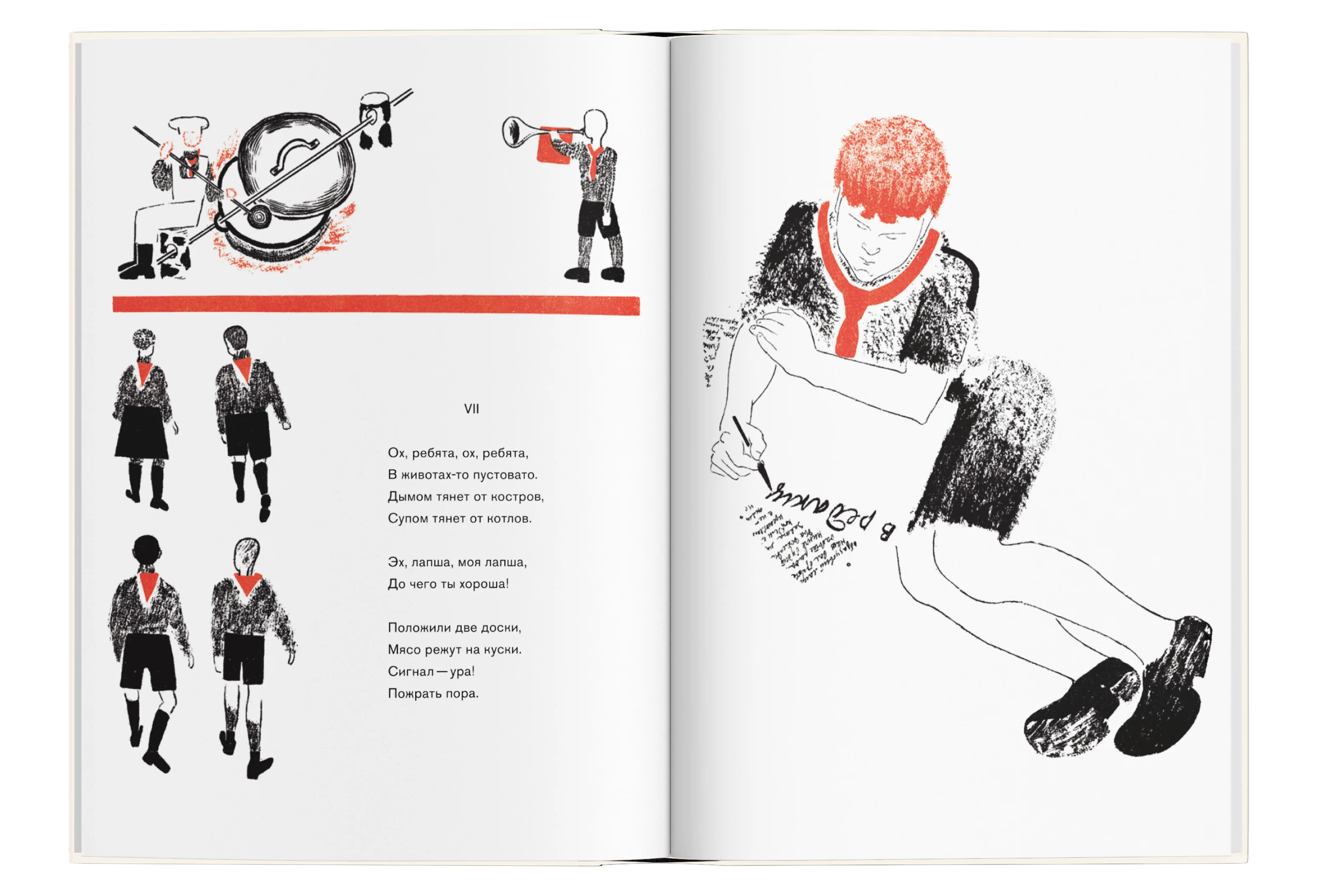 Вся книжка «Лагерь» построена на двух цветах, и при этом ее полосы напоминают репродукции с живописи. Причина — литографская печать, оттиски делались с камней, они роскошно передают фактуру материала, живость зерна литографского камня. Красно-черные заливки хорошо гармонируют с проработкой а-ля сухая кисть. Секрет художника еще и в найденном способе передачи пространства: плоскостное решение композиций восходит к древнерусским иконописным клеймам, к «праздникам» со складней. Пахомов с детства видел и глубоко любил старую икону.