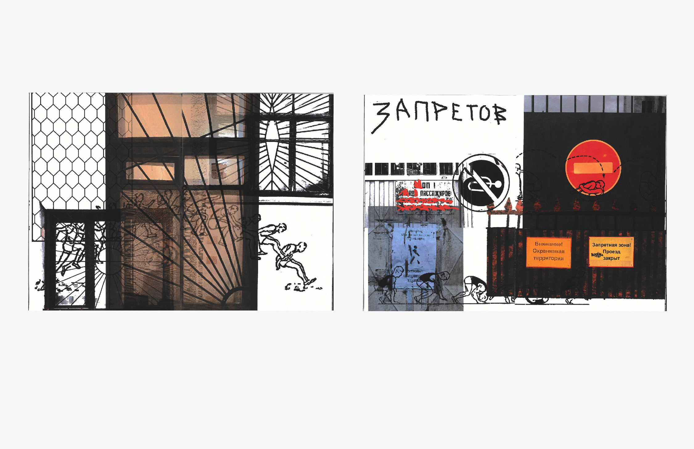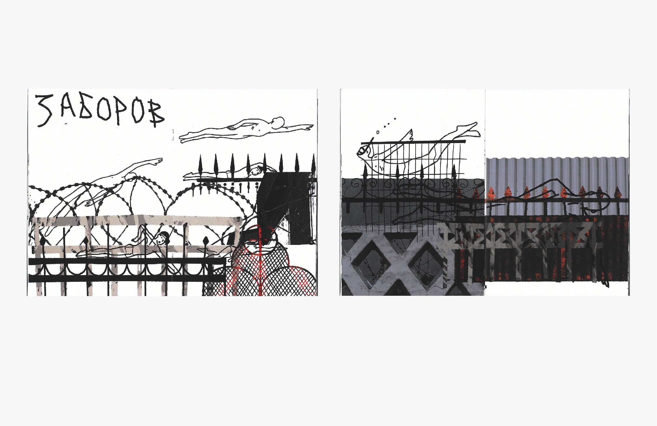 «Из угла в угол» - размышление о человеке и его взаимоотношениях с городским пространством. Переезжая с одного съемного жилья на другое, я ловила себя на мыслях, что чувство дома начинается с улиц. При этом довольно часто, внешнее, имея в виду в данном случае, городскую среду – это те условия на которые мы не можем повлиять, с которыми приходится сосуществовать. Каждый раз «обживая» очередную местность, ты создаешь личную топографию и трансформируешь окружающее тебя городское пространство в собственный «угол». Проведя небольшое исследование архитектурных символов правой стороны Обводного канала, я заметила в его облике большое количество символов несвободы: различных ограждений, решеток, камер, заборов, закрытых предприятий и т.д. Эта территория постоянно диктует тебе определенные программы поведения, и тебя охватывает чувство тесноты. Я стала трансформировать изображения этих элементов, создавая с их помощью новые визуальные метафоры, тем самым превращая «тесноту» в «угол», пригодный для обитания. Сопровождающие иллюстрации схематичные рисунки плавания, кувырков, прыжков на скакалке оставлены на страницах, как воображаемые рекомендации к действию. Можно перепрыгнуть через решетки, поплавать в волнах заборов, кувырком сбежать от запретов и т.д.