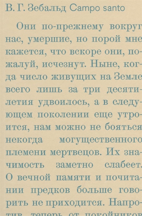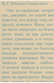 «Campo santo», посмертный сборник В.Г. Зебальда, объединяет все, что не вошло в другие книги писателя, — фрагменты прозы о Корсике, газетные заметки, тексты выступлений, ранние редакции знаменитых эссе. Их общие темы — устройство памяти и забвения, наши личные отношения с прошлым поверх «больших» исторических нарративов и способы сопротивления небытию, которые предоставляет человеку культура.