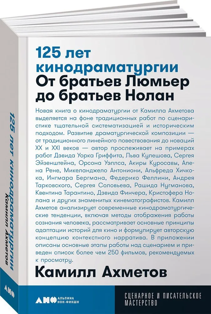 Новая книга о кинодраматургии от Камилла Ахметова выделяется на фоне традиционных работ по сценаристике тщательной систематизацией и историческим подходом. Развитие драматургической композиции — от традиционного линейного повествования до новаций XX и XXI веков — автор прослеживает на примерах работ Дэвида Уорка Гриффита, Льва Кулешова, Сергея Эйзенштейна, Орсона Уэллса, Акиры Куросавы, Алена Рене, Микеланджело Антониони, Альфреда Хичкока, Ингмара Бергмана, Федерико Феллини, Андрея Тарковского, Сергея Соловьева, Рашида Нугманова, Квентина Тарантино, Дэвида Финчера, Кристофера Нолана и других знаменитых кинематографистов. Камилл Ахметов анализирует современные кинодраматургические тенденции, включая методы отображения работы сознания человека, рассматривает основные принципы адаптации историй для кино и формулирует авторскую концепцию контекстного нарратива. В приложении описаны основные этапы работы над сценарием и приведен список более чем 250 фильмов, рекомендуемых к просмотру.