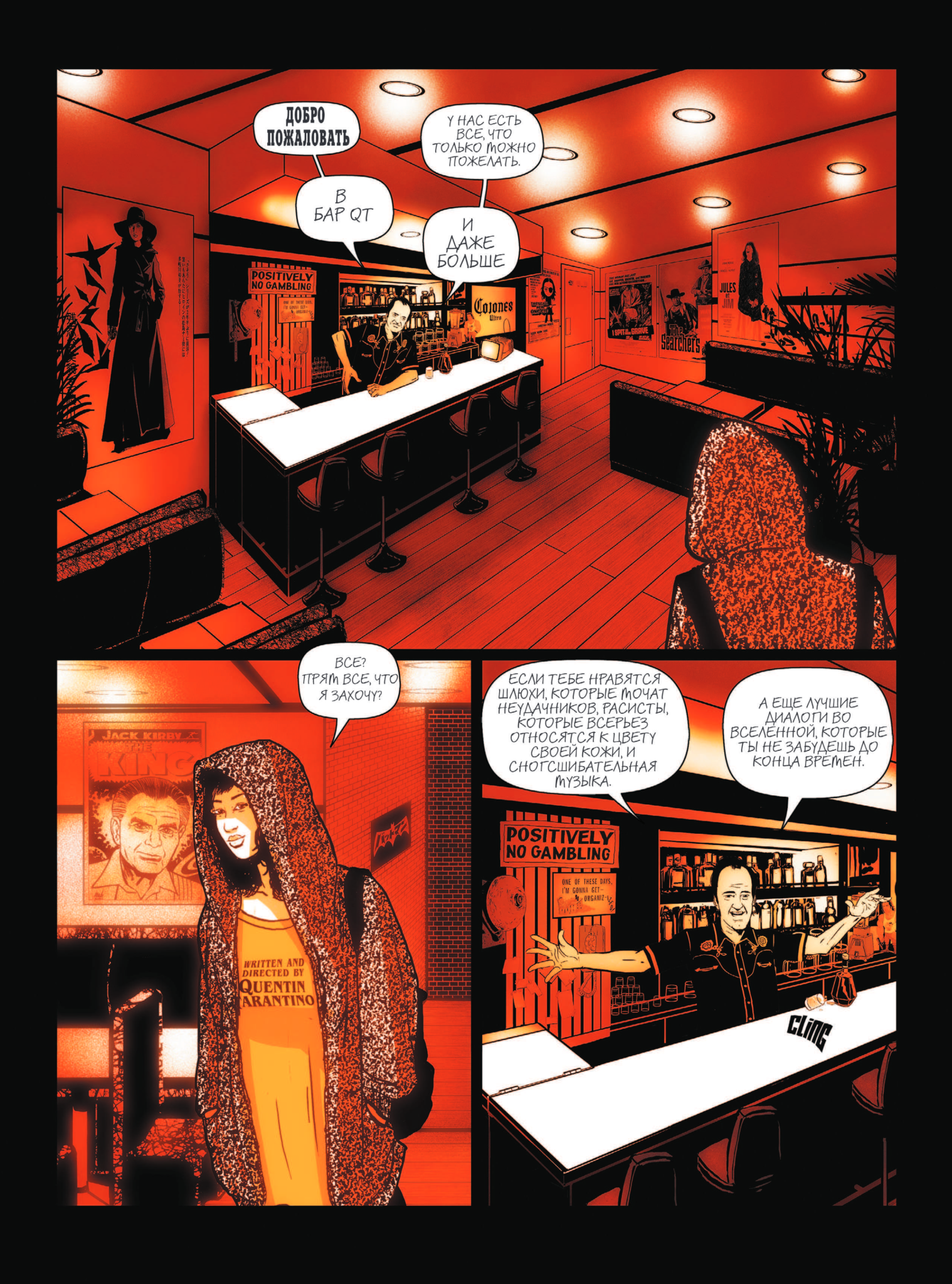 Сюжет книги детально повторяет весь творческий путь режиссера и изобилует большим количеством деталей, отсылок и малоизвестных фактов о жизни Квентина. Так что даже опытные поклонники Тарантино непременно узнают много нового о своем любимом режиссере, а также проведут немало времени за поиском различных оммажей на кадры из фильмов.