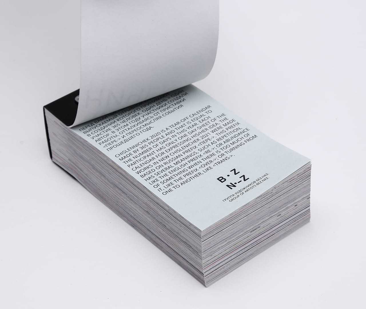 Численничек — это проект отрывного календаря, в создании которого принимают участие 365 человек. Участнику для воплощения собственной идеи отводится один календарный лист, который затем становится частью коллективного высказывания. Создатели календаря — группа «без.наз.» — определяют общую тему, концепцию, предлагаемую для индивидуального осмысления каждым участником. Итогом становится материальный объект — отрывной календарь на будущий год, который в то же время является и коллективной выставкой.