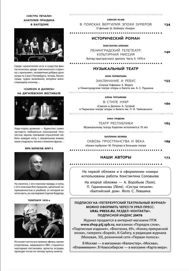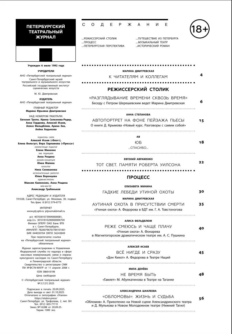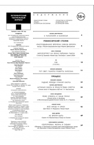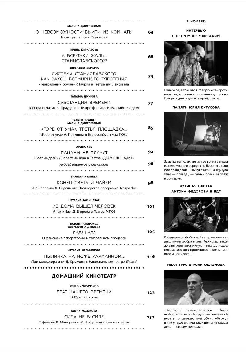 В этом номере (его оформил сценограф Константин Соловьев) мы провожаем Юрия Бутусова и Боба Уилсона, беседуем с Петром Шерешевским и разбираемся с «Утиными охотами», с «Обломовыми», «Горем от ума», «Гамлетом», «Театральным романом», «Сестрой печали», «Соловками», «Чижом и Ежом», «Тремя мушкетерами», с режиссерами Федоровым и Праудиным, Габриа и Егоровым, Прикотенко и Мульковым, Абулкатиновым и Крымовым, пишем о лабораторном движении, зародившимся в России и пересаженном на европейскую почву…Мы продолжаем вспоминать старый ленинградский телетеатр с его прекрасными лицами.