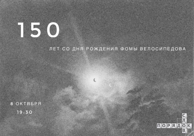 8 октября в 19.30 в «Порядке слов» празднуем предстоящую 150-ю годовщину со дня рождения знаменитого поэта, прозаика, переводчика и перформансиста Фомы Велосипедова, известного также как Ф.Ангелович, Варвара Полумаркова и Арнольд Вельтшмерц.