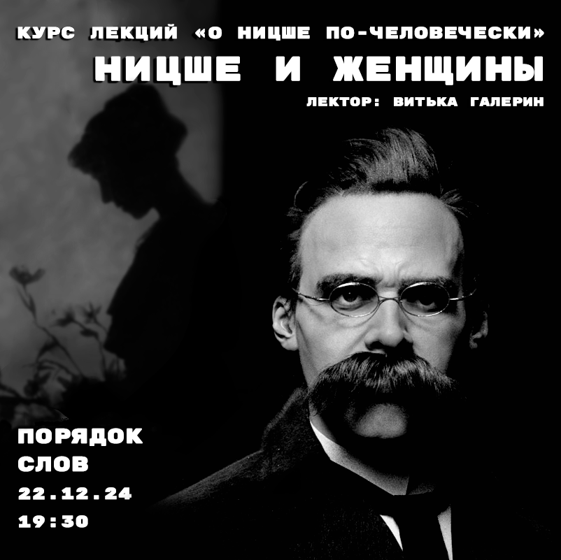 22 декабря в 19.30 в «Порядке слов» на Фонтанке вторая встреча цикла «По-человечески о Ницше». Попробуем разобраться в сложном отношении философа к женщинам, их роли в социуме, политике и мире в целом. Лектор – Вадим Тарабурин, аспирант «Русской Христианской Гуманитарной Академии им. Ф.М. Достоевского».