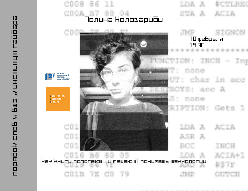 10 февраля в 19.30 в Порядке слов встреча с Полиной Колозариди – исследовательницей, руководительницей DH-центра в университете ИТМО и старшей научной сотрудницей ЕУСПб. Вместе обсудим, как книги помогают (и мешают) понимать технологии.